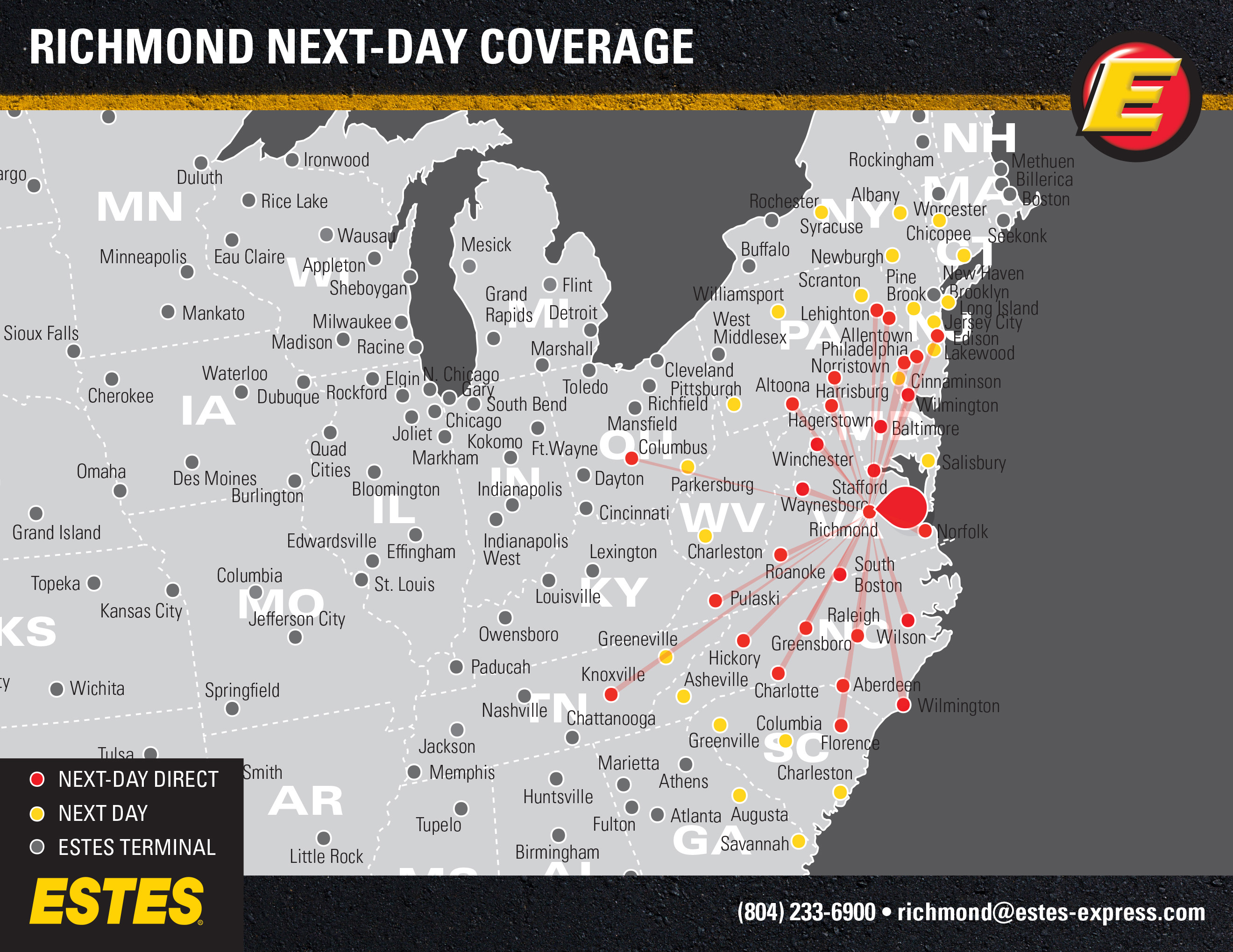 Estes offers next-day direct LTL freight shipping from Richmond to Philadelphia, Charlotte, Columbus, Baltimore, Raleigh, Knoxville, Norfolk, Greensboro, and Wilmington, as well as next-day LTL to NYC, Pittsburgh, New Haven, Syracuse, Savannah, Charleston, Columbia, Asheville, and more. Learn about the benefits of shipping through this hub terminal.
